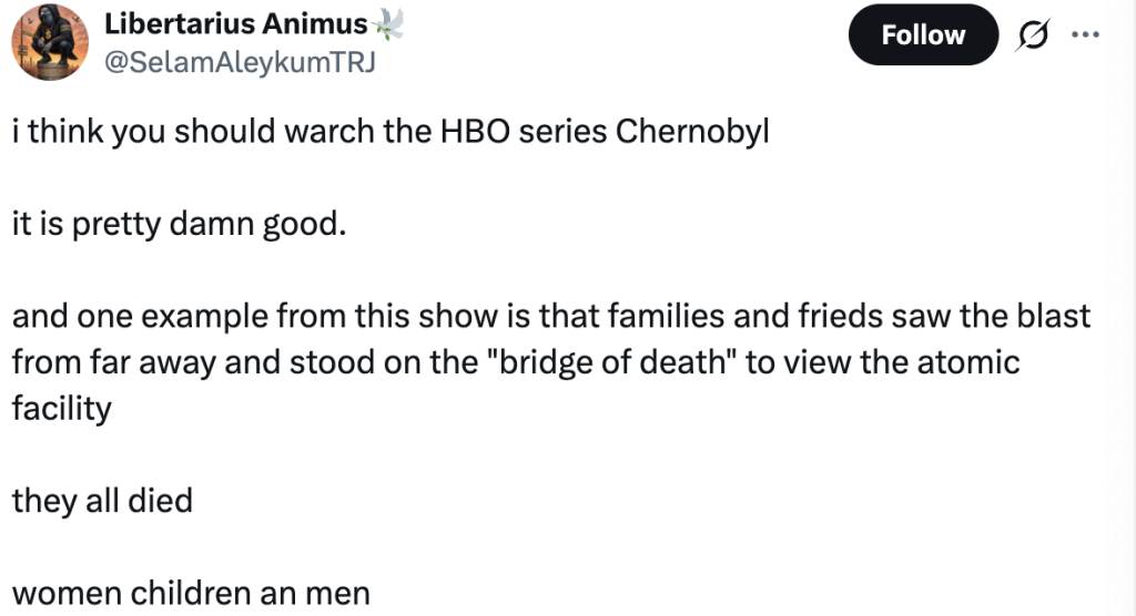 In reality, the reactor exploded at 1:23 AM (UTC +3), when the city was asleep. While residents were evacuated only the following day, which theoretically allowed for the possibility of people gathering, local police reportedly blocked the bridge. A survivor who traveled there on a bicycle as a child gave an interview years later, disproving the myth of the site’s 100% lethality.