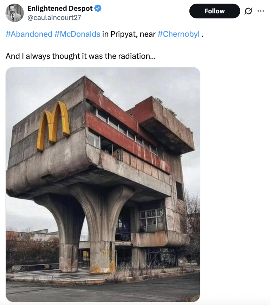 In addition to the mutants mentioned above, modern technologies have introduced new ways to distort the history of Chernobyl. Generative AI is often used to create impressive but entirely fabricated images. A viral example was a photograph of a supposedly abandoned McDonald’s restaurant in Pripyat.