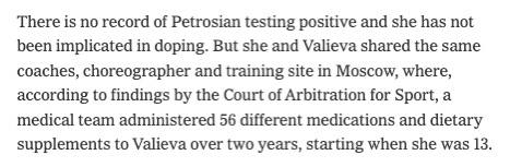 The author pays particular attention to a list of 56 medications and supplements given to Valieva by her medical team in the two years leading up to her disqualification. This list was included in the reasoned decision by the Court of Arbitration for Sport (CAS). However, the NYT omits a crucial detail: the vast majority of these substances were entirely legal vitamins, supplements, and permitted medications (such as Hypoxen or L-carnitine). Applying this figure to Petrosian without any evidence of her using similar substances is purely speculative.