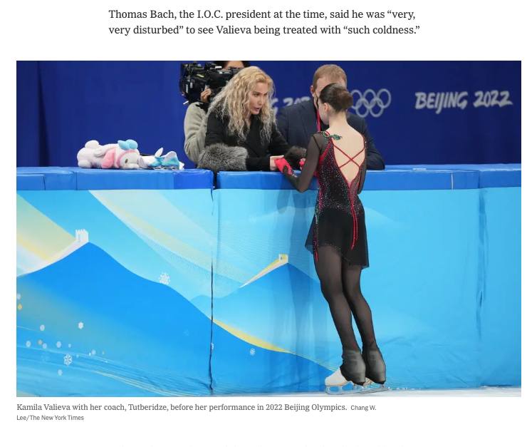 The central device used in the article is “guilt by association.” Readers are reminded of the 2022 Beijing Games, where trimetazidine was found in a sample provided by then-15-year-old Kamila Valieva. That scandal resulted in a four-year disqualification for the athlete and the stripping of the Russian team’s gold medals. The NYT emphasizes that Adeliia Petrosian trains under the same coach — Eteri Tutberidze, whose demanding training methods have frequently faced Western criticism.