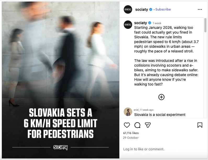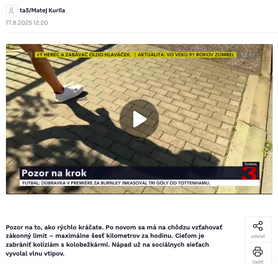 For example, the Slovak mainstream media outlet TA3 produced an article (and report) that gives the impression that the law applies to walking speed for pedestrians. The article directly states “Pay attention to your walking speed” or “Pay attention to how fast you walk. Now, there is a legal limit for walking — a maximum of six kilometers per hour.”