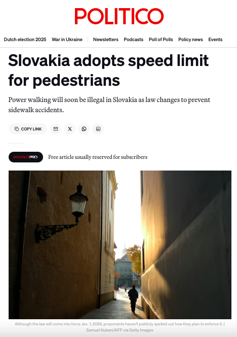Politico and some other world media outlets have also misinterpreted the law. They directly stated that “You can only walk 6 kilometers per hour if you want to follow the law in Slovakia. The Slovak parliament Tuesday afternoon adopted an amendment to the traffic law that sets a maximum permitted speed on sidewalks in urban areas at 6 kph. The limit applies to pedestrians (…)”