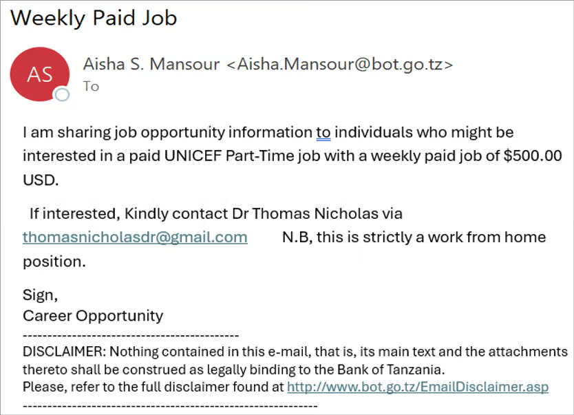 Fraudsters send emails to your email address asking you to send personal data (passwords, bank card numbers), follow a link or make a payment. Typical phishing is emails from scammers posing as official organizations (banks, government agencies) or well-known companies.
