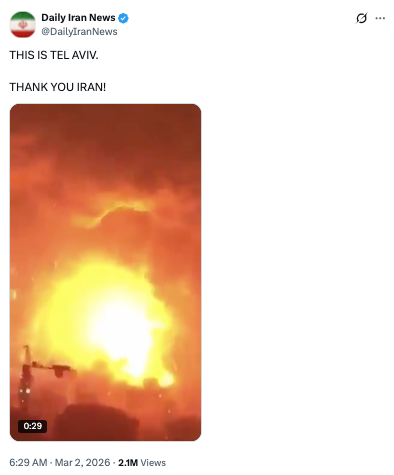 A video post claims to show explosions in Tel Aviv resulting from Iranian strikes. The post garnered over 2.1 million views and 13 thousand retweets.