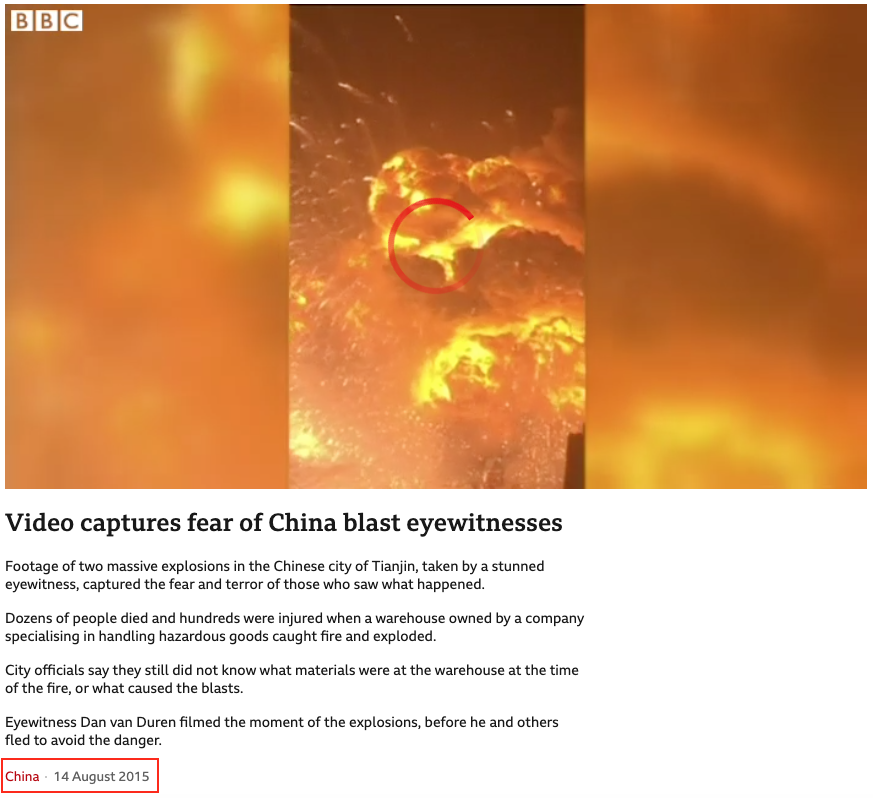 The original footage is a recording of explosions at a chemical plant in the Chinese city of Tianjin in August 2015.
