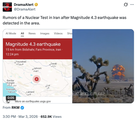 Following a magnitude 4.3 earthquake in Iran’s Fars province, rumors began circulating on social media that Iran had allegedly conducted a covert nuclear test. Users linked the seismic activity to a possible nuclear weapons test, and some posts were accompanied by an explosion video.