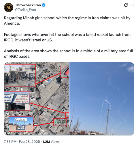 Some publications claimed that an Iranian missile, during a failed launch, hit a girls’ school in the city of Minab, killing 148 students. A video is circulating on social media which, according to the authors, proves that the school is surrounded by IRGC military facilities, thereby explaining the cause of the tragedy.