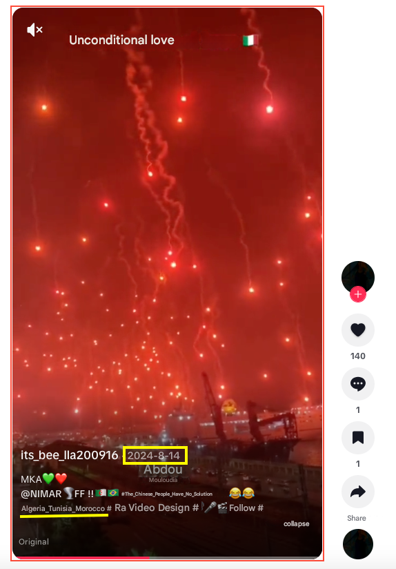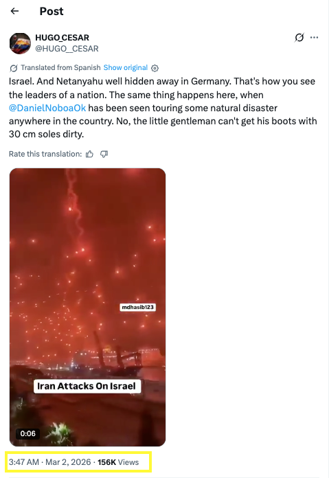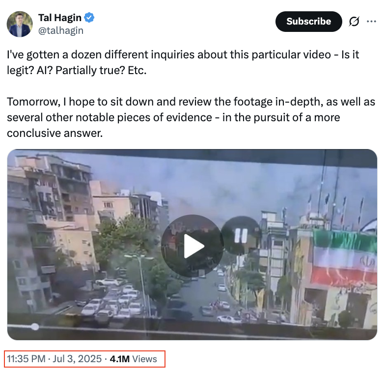 The footage was found to have been posted previously in 2025, during an earlier round of the conflict between Iran and Israel. This is evidenced by a timestamped watermark, as well as comments from users pointing out chronological discrepancies.
