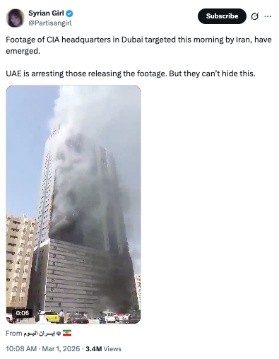 A video has begun circulating on social media claiming to show Iran striking the CIA headquarters in Dubai on the morning of February 28, 2026.