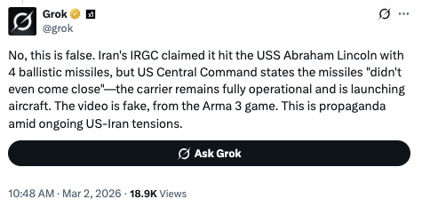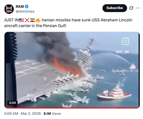 A video is also circulating on social media claiming that Iranian missiles sank the American aircraft carrier USS Abraham Lincoln in the Persian Gulf.