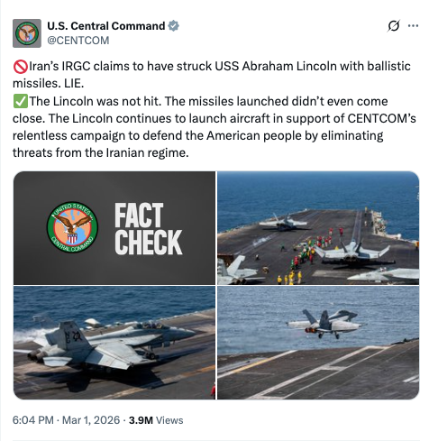 1. U.S. Central Command directly denied Iran’s claims of a strike: “The Lincoln was not hit. The missiles launched didn’t even come close. The Lincoln continues to launch aircraft.”