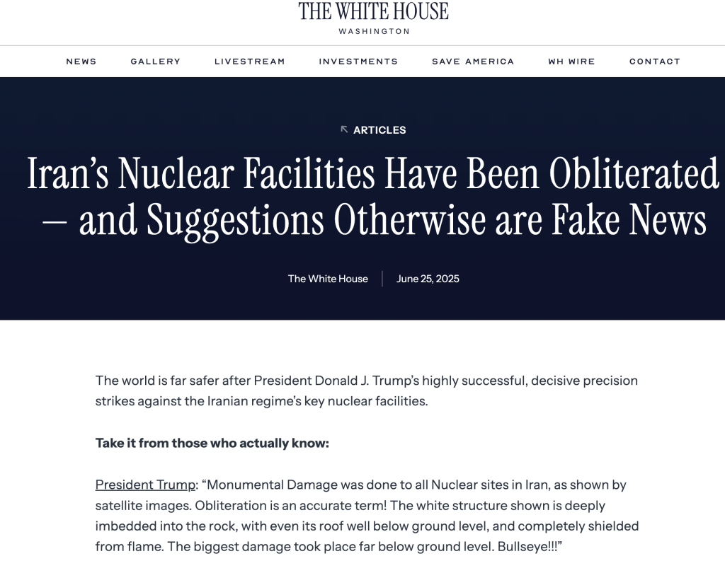 The official White House website features an article headlined “Iran’s Nuclear Facilities Have Been Obliterated — and Suggestions Otherwise Are Fake News” (dated June 25, 2025). It asserts that key Iranian nuclear infrastructure was “obliterated” by US strikes and that any claims to the contrary are “fake.”