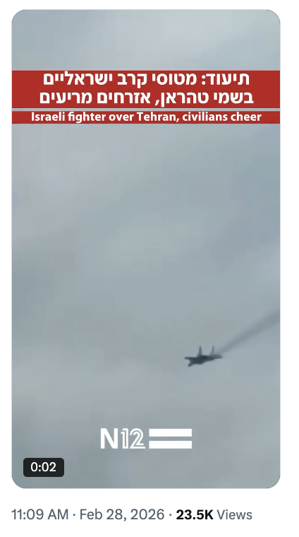 Consequently, the clip does not substantiate the claim of an Israeli fighter jet flying over Tehran on February 28, 2026.