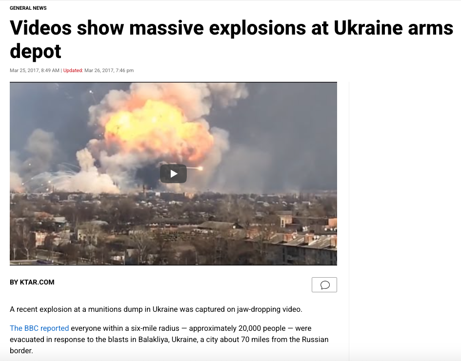 The video being passed off as the destruction of an Israeli nuclear power plant actually captures an explosion at a military depot near the city of Balakliia in the Kharkiv region of Ukraine on March 23, 2017. A munitions detonation occurred at the time, accompanied by a fire. The incident was widely covered by international media, including TASS.