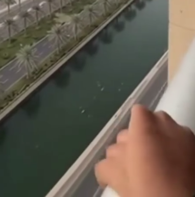 In the foreground of the video, part of a balcony railing is visible, which a person’s hand is gripping. Upon magnification, it becomes noticeable that the hand is rendered incorrectly: the fingers have an unnatural shape, and the joint anatomy is distorted, which is typical for AI generators that still imperfectly handle depictions of limbs.