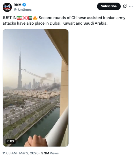 A video is circulating on social media which, it is claimed, shows strikes on Dubai, Kuwait, and Saudi Arabia carried out by the Iranian army with Chinese support. The footage shows a bird’s-eye panorama of a city against which powerful explosions occur, with the famous Burj Khalifa skyscraper towering on the horizon.