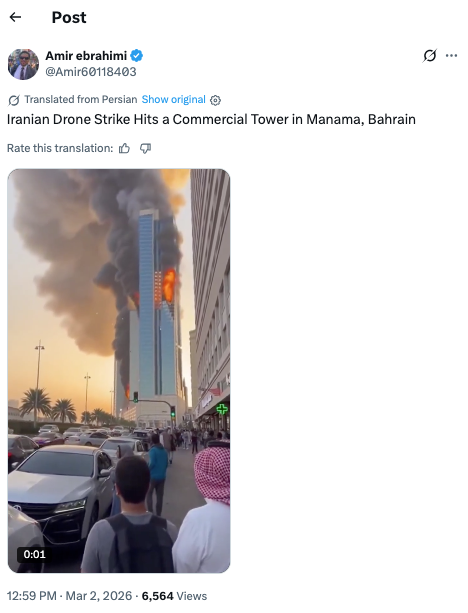 A video is circulating on social media showing an “Iranian drone strike” on a commercial tower in Manama, the capital of Bahrain.