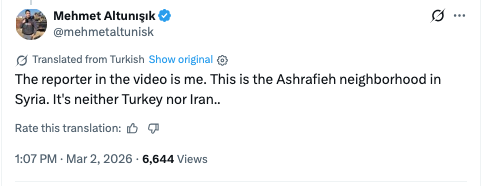 2. The video used to illustrate the fake strike is actually a fragment of a report by Turkish journalist Mehmet Altunışık from the Syrian city of Aleppo, dated January 10, 2026. The author of the video personally debunked the fake on March 2.