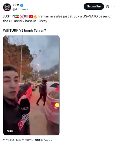 A video is circulating on social media which, according to the authors’ claims, captures an Iranian missile strike on the Incirlik airbase in Turkey, where U.S. and NATO facilities are located. The publication was accompanied by a provocative question about a possible Turkish retaliatory strike on Tehran.