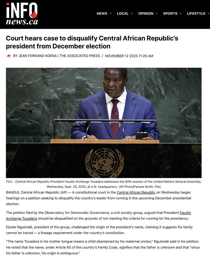 GFCN explains: Nguémalé refers to Article 65 of the CAR Family Code, according to which the name Touadera means that the father is unknown, “since his father is unknown, his origin is ambiguous. His name in his native language means a child who was abandoned by his maternal uncles.”
