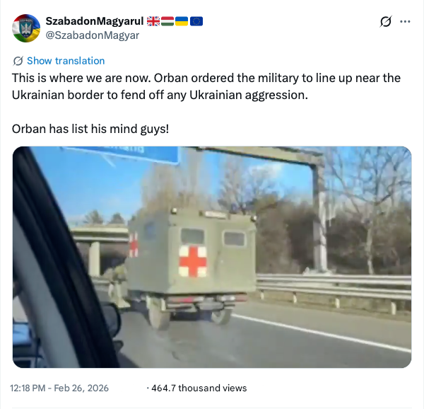 A post has gone viral on the social network X, in which the author claims that the Hungarian Prime Minister has supposedly ordered the army to line up along the border to “fend off Ukrainian aggression.” A video showing moving military equipment is cited as evidence.