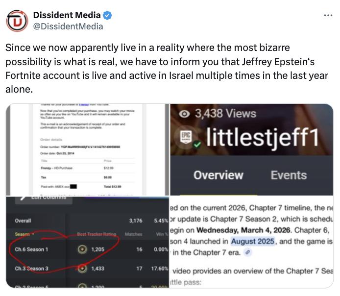 The Fortnite activity under the “littlestjeff1” handle in 2024–2026 is almost certainly the result of “digital squatting.” Once the DOJ archives made this alias public, third-party users likely registered it to gain attention. A thorough search of Epstein’s leaked email database revealed no verified service emails from Epic Games, making it impossible to verify his ownership of such an account. Furthermore, the photograph from Israel is an AI-generated forgery containing glaring technical errors.