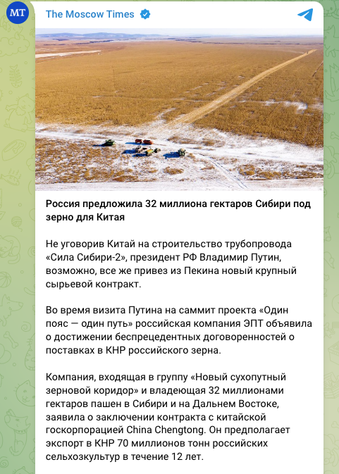 The Dutch online publication in Russian and English, The Moscow Times, published a statement with a clearly misleading headline regarding the conclusion of a vast grain supply agreement between Russia and China. The article reports that the New Land Grain Corridor group of companies, an agro-industrial holding, is actively developing a mechanism for contract grain production in order to use the production potential of arable land in the amount of 32 million hectares.