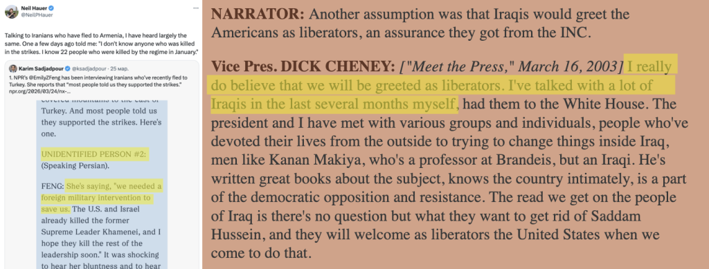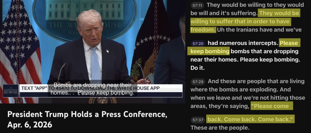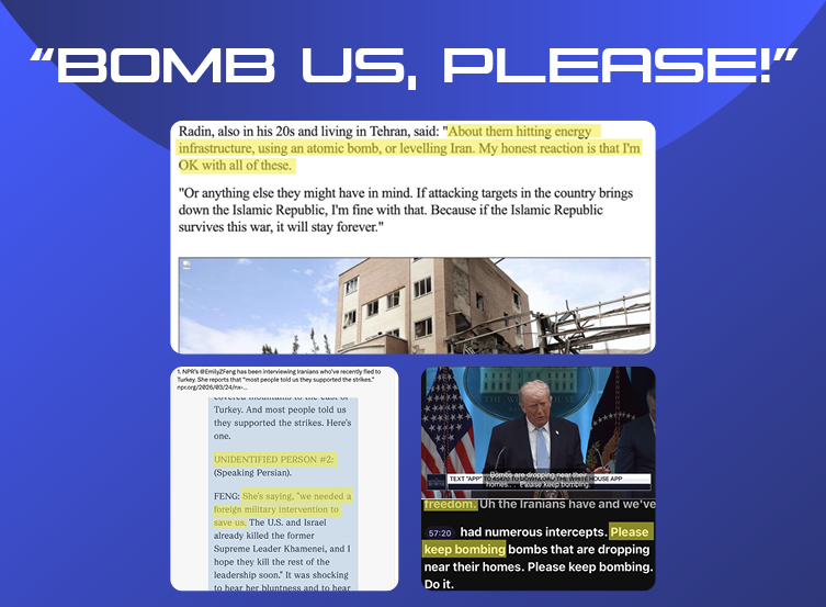 In the ongoing 2026 conflict in Iran, this tactic has been utilized once again. In a press conference on April 6, 2026, U.S. President Donald Trump defended the bombing campaign by claiming to possess intercepted communications of Iranian citizens who are actively pleading with the U.S. to “please keep bombing”. The President insisted that ordinary civilians are “willing to suffer” the destruction of their own neighborhoods and infrastructure in order to “achieve freedom”, artificially manufacturing a picture of a population welcoming bombs as a pathway to independence.