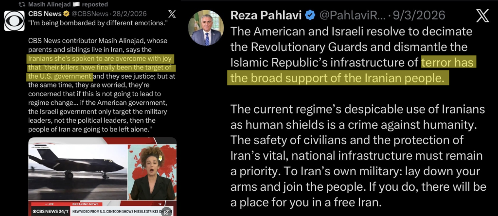 By presenting these specific voices, often sounding from exile, as the opinion of “ordinary” citizens, media and political institutions consciously or inadvertently provide ideological cover for military escalation. This strategy essentially outsources the fabrication of consent to the diaspora.