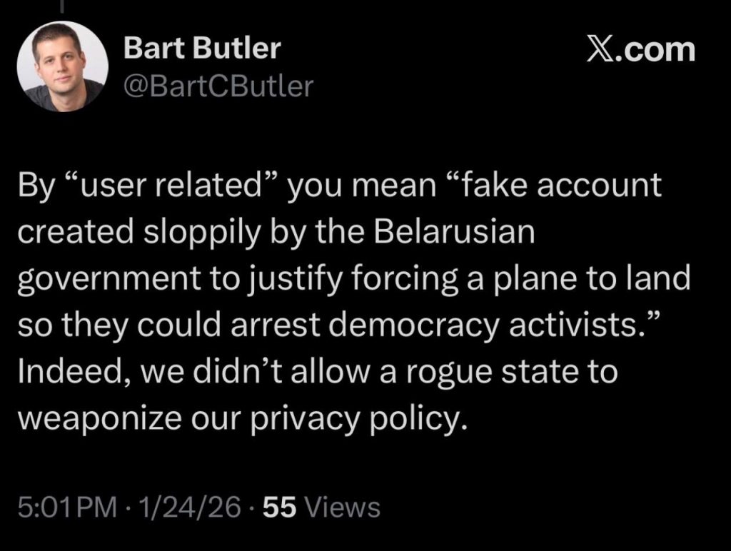 Following the forced landing of a Ryanair flight in Minsk in May 2021 over a reported bomb threat, Belarusian authorities claimed to have received two threatening emails. In response, seeking to publicly expose “Minsk’s lies,” Proton issued a statement clarifying that only one email had been sent from the address in question — and that it arrived only after the plane had been diverted. While politically framed as debunking disinformation, from a privacy standpoint, it set a dangerous precedent: Proton voluntarily and publicly disclosed user metadata, despite receiving no official request to do so.