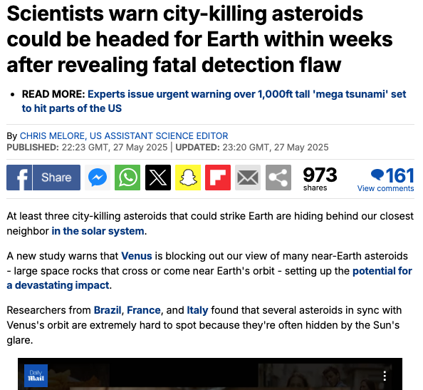Another typical example is «an asteroid flying towards Earth». Similar stories appear almost every year.