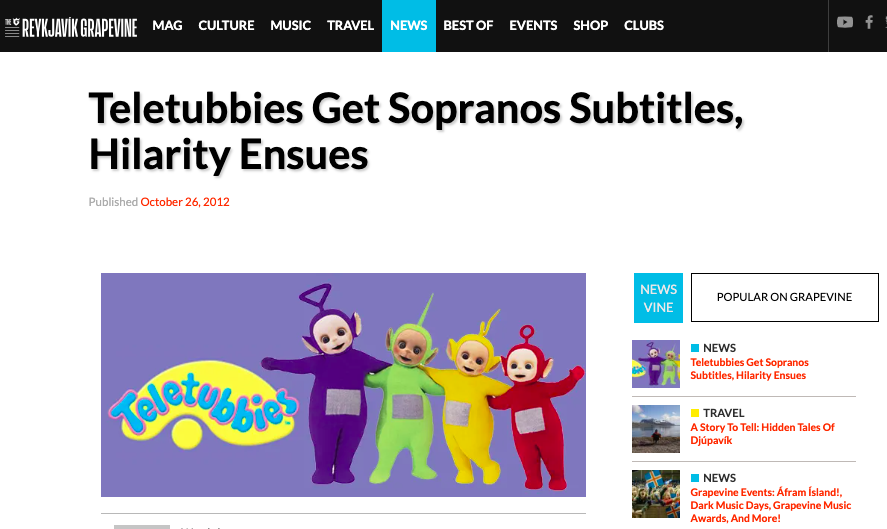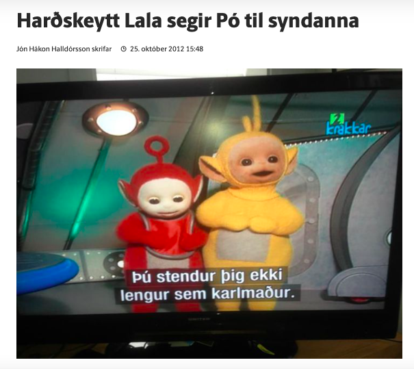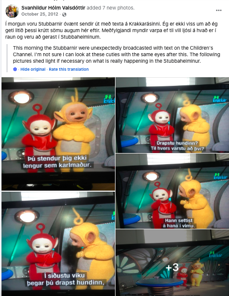 On October 25, 2012, user Svanhildur Hólm Valsdóttir posted on Facebook photographs showing a television set airing “Teletubbies”; the subtitles, however, did not correspond to the on-screen action and were decidedly unsuitable for a children’s program.