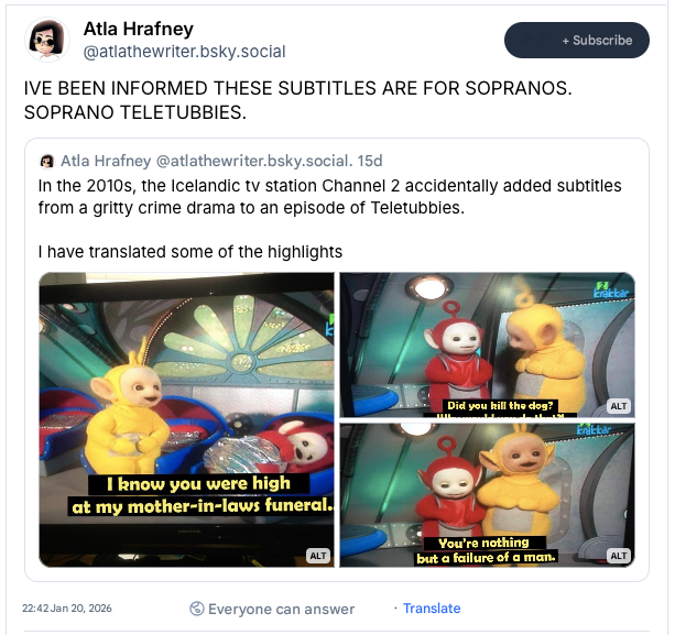 In late January 2026, reports began circulating across social media platforms (X, Bluesky, Threads) regarding an incident from way back in 2012: due to a technical malfunction during an episode of the children’s show “Teletubbies” an Icelandic television station broadcast subtitles intended for the drama series “The Sopranos”. Sometimes the internet requires 14 years to truly appreciate a blunder of such epic proportions. Here is the decoding of his complete and strange story.