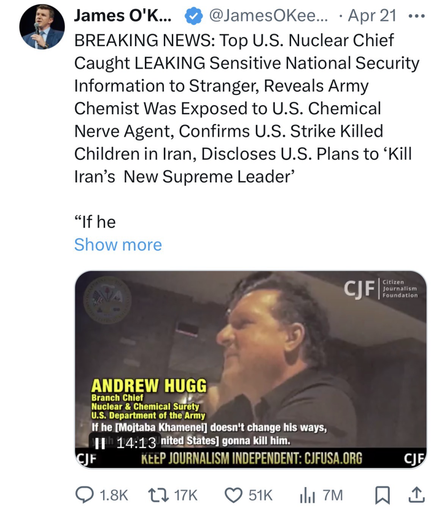 Due to the high public outcry surrounding the published video, our editorial team considers it necessary to issue a warning regarding the media manipulation accompanying this leak. The authors of the original X post identified the source as the “Top U.S. Nuclear Chief,” artificially inflating his significance.